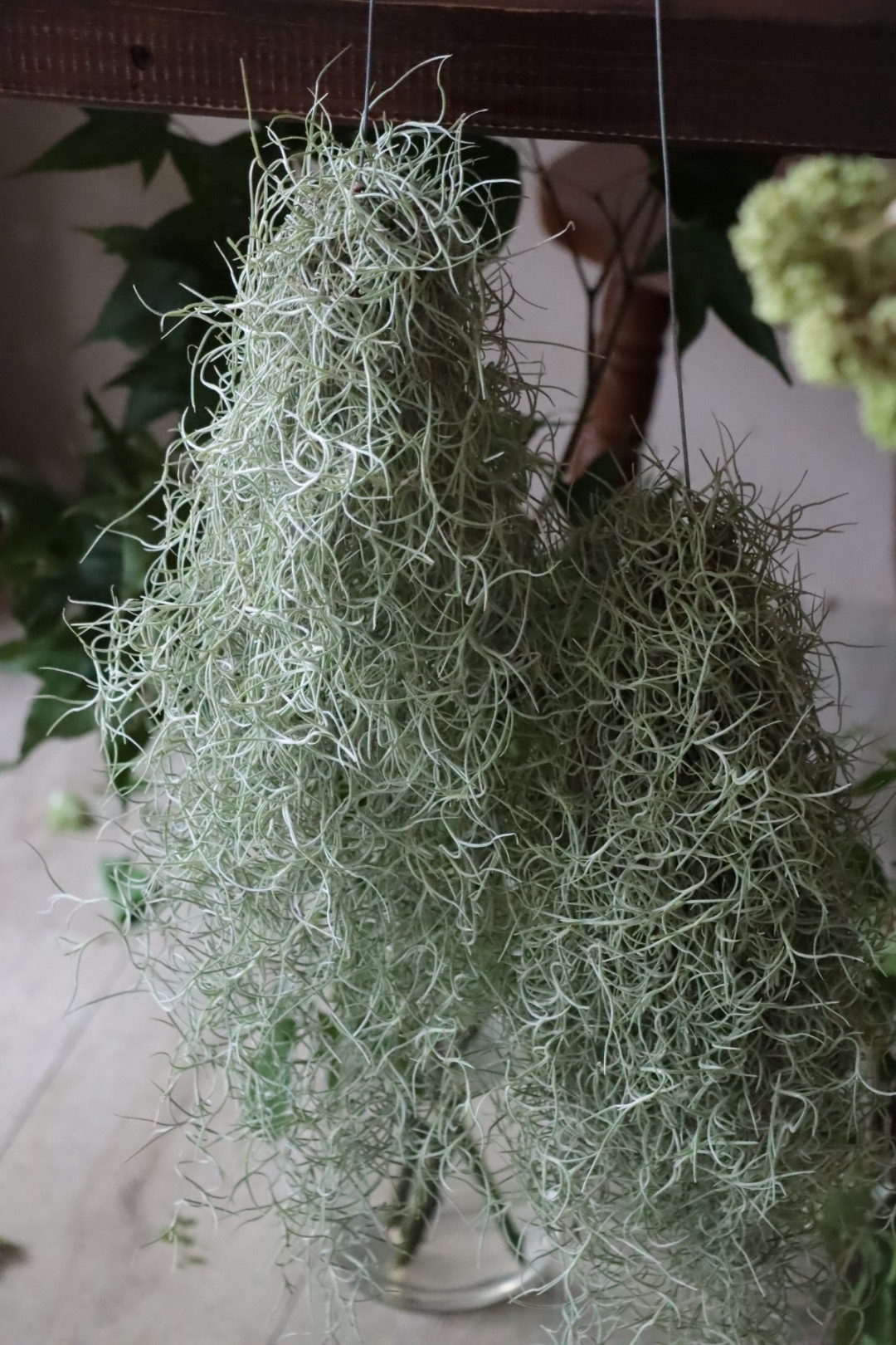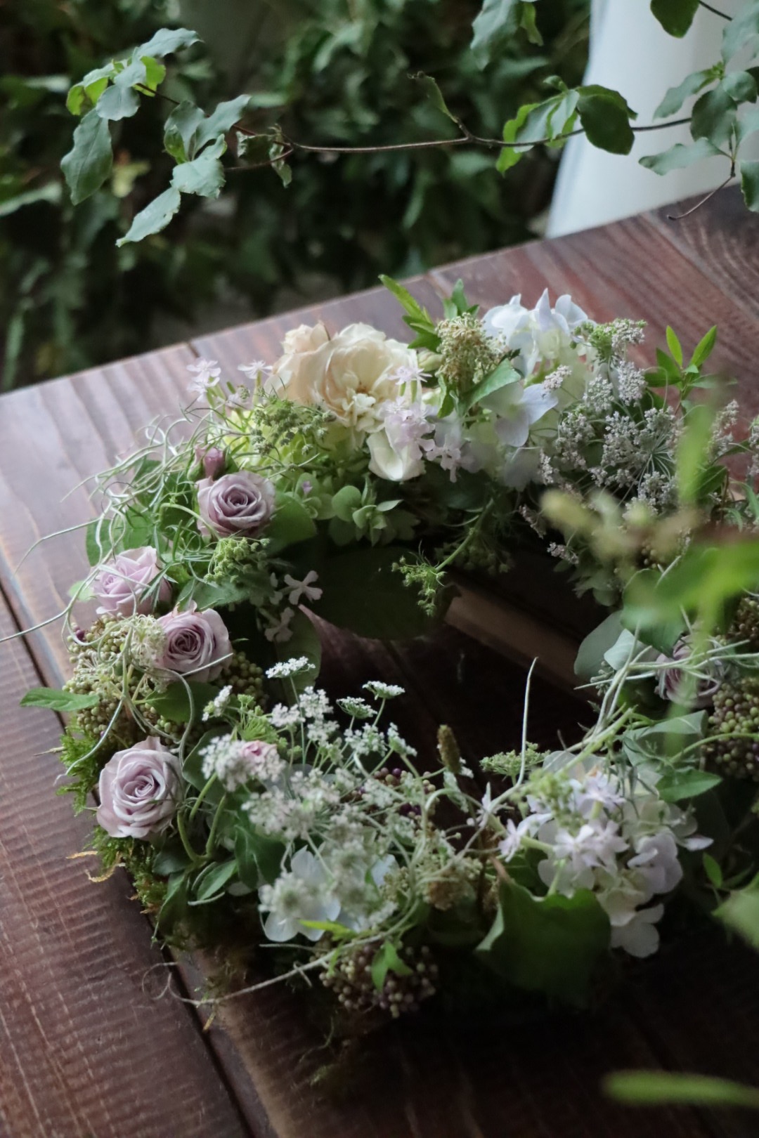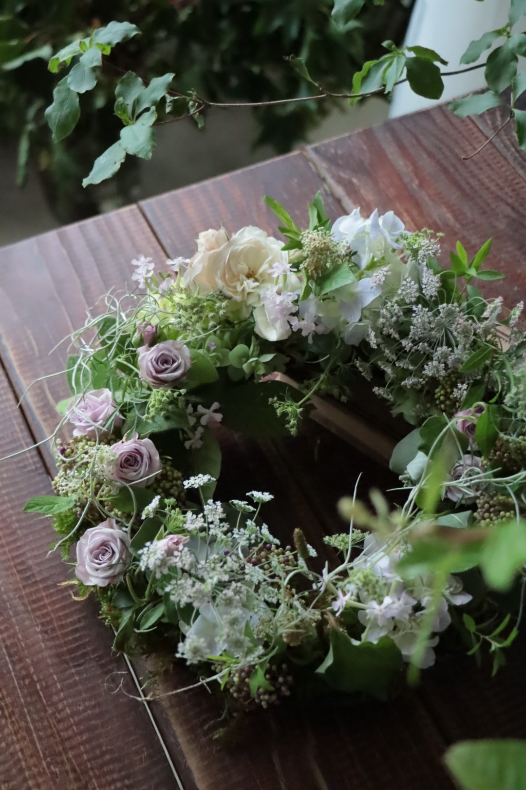 常會看到植栽與鮮花在同一個花圈上的作品 。